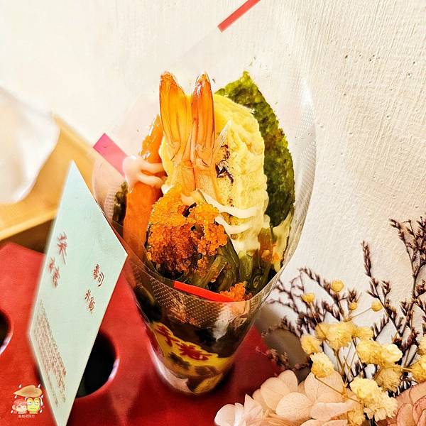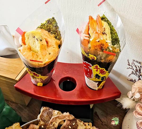 手捲裡除了米飯還加了玉子燒﹐少數手捲會添加玉子燒﹐有的連米飯都沒有只有高麗菜絲﹐而桑桔這樣一個才35、40元真的非常便宜﹐手捲還使用透明袋裝﹐避免海苔接觸到裡面餡料而變軟