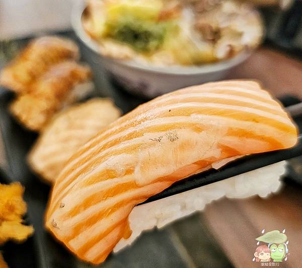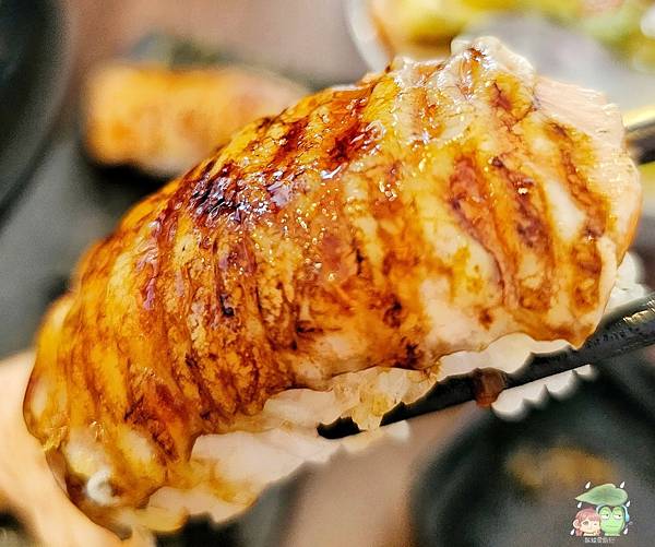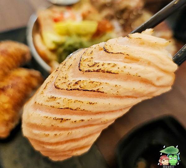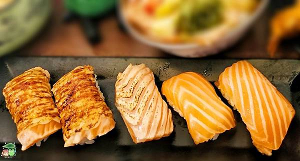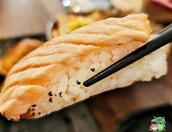 炙燒過後的鮭魚表面焦香裡面軟嫩﹐不敢吃太生的人可以點炙燒﹐除了鮭魚口感扎實以外就連米飯也相當扎實﹐咬一半也不會散掉﹐不像其他日式料理的握壽司邊吃邊掉﹐超麻煩!來到桑桔一定要點握壽司!